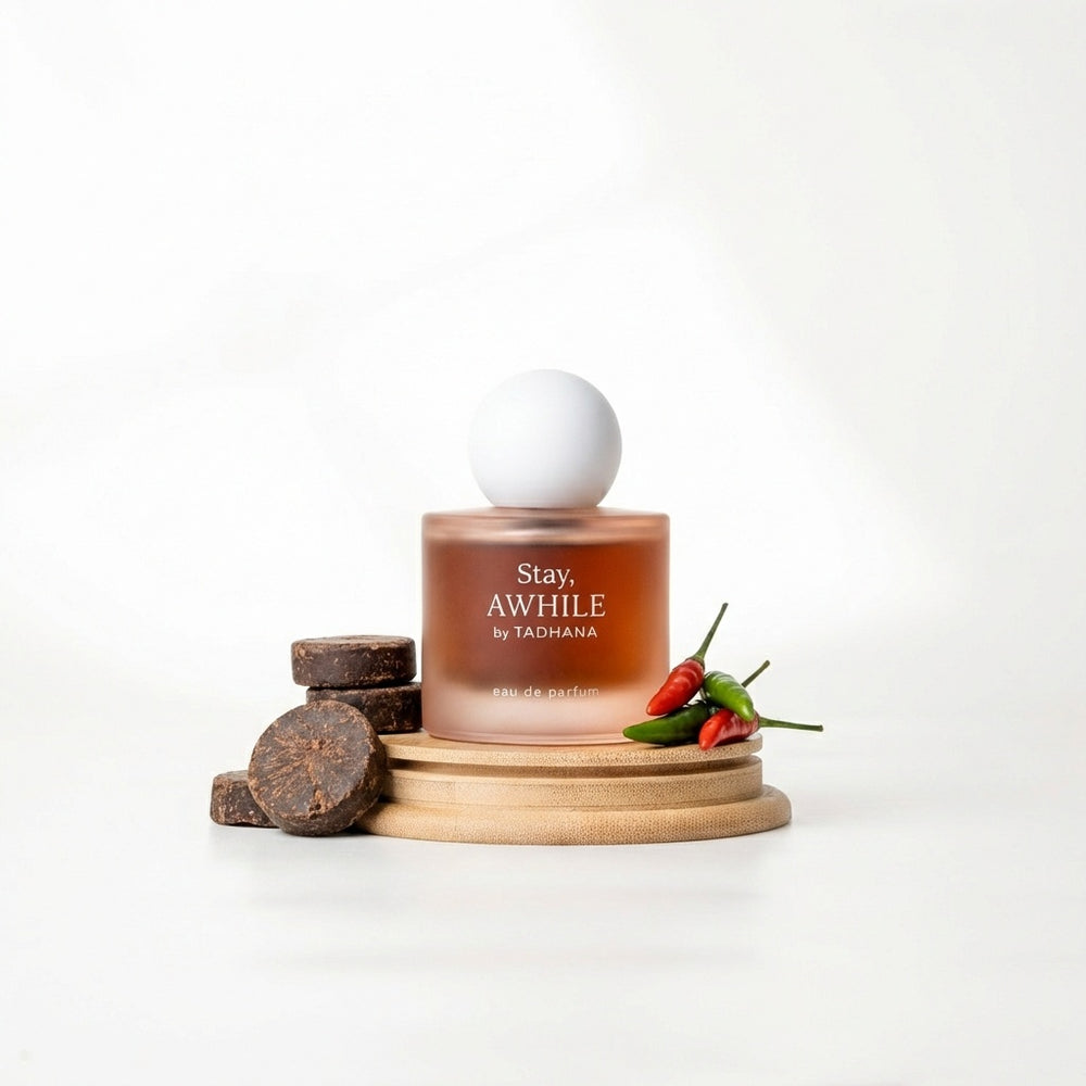 Stay Awhile is a spiced cocoa fragrance for lingering thoughts. The kind that change the shape of your day.